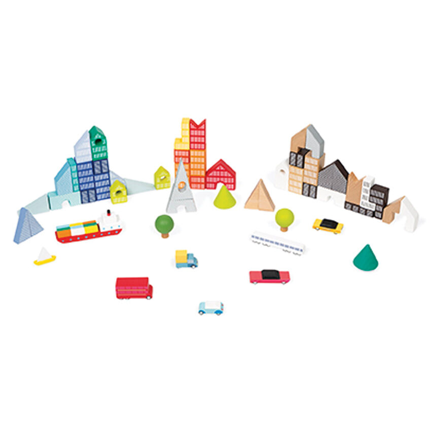 The pieces are made of solid wood and painted using water-based paint. They open up a huge range of possibilities for aspiring designers - cities, towers, landscapes - you name it, you can build it!