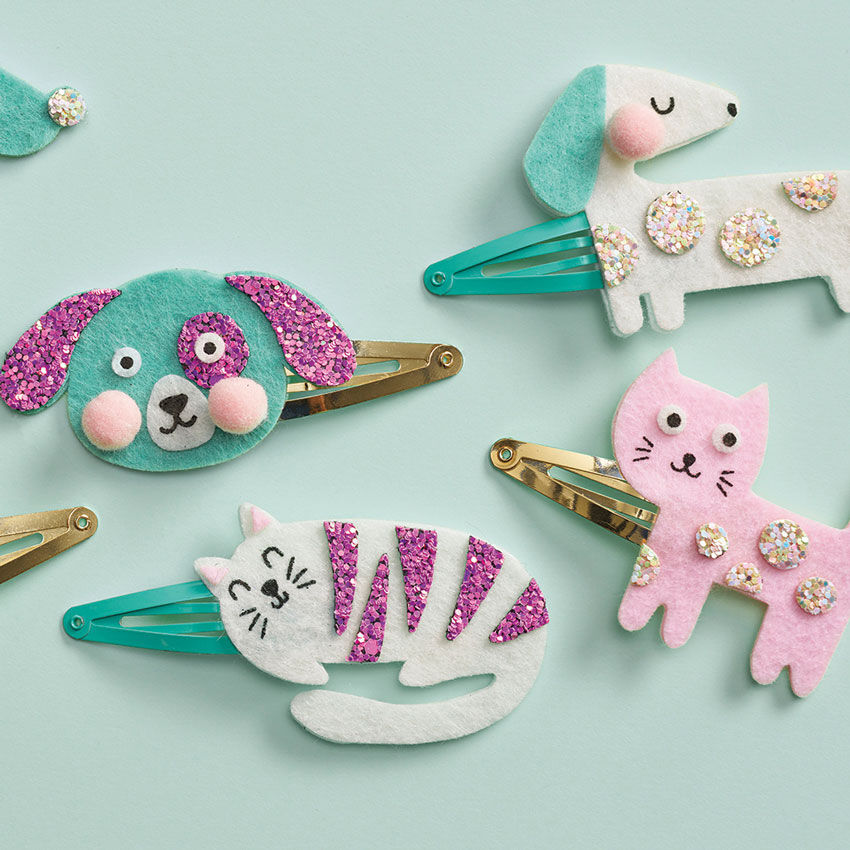 Create your own adorable dog and cat themed hair accessories with the Pets Hairclip Kit!